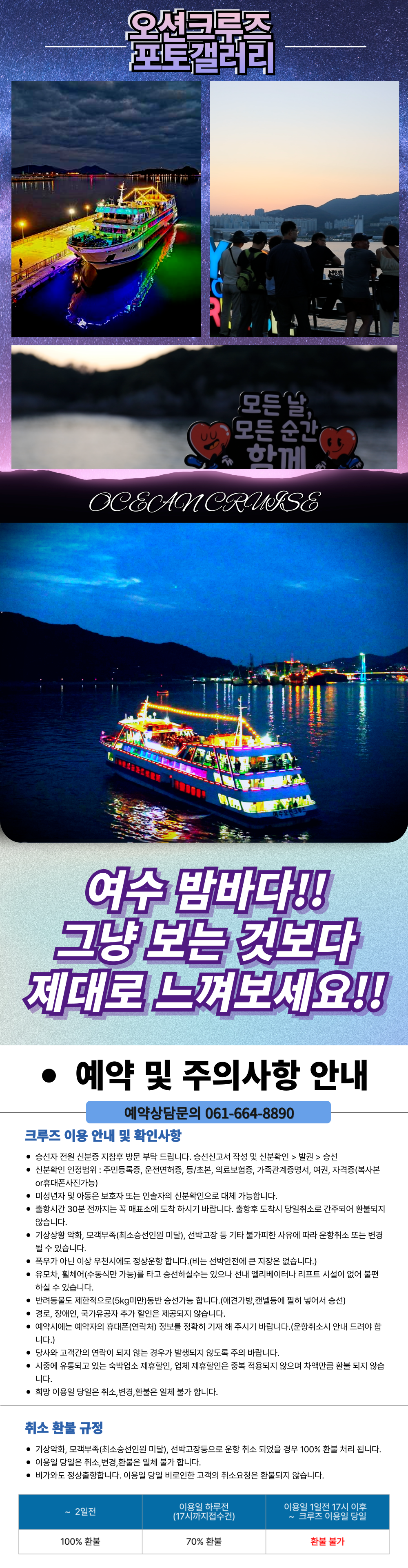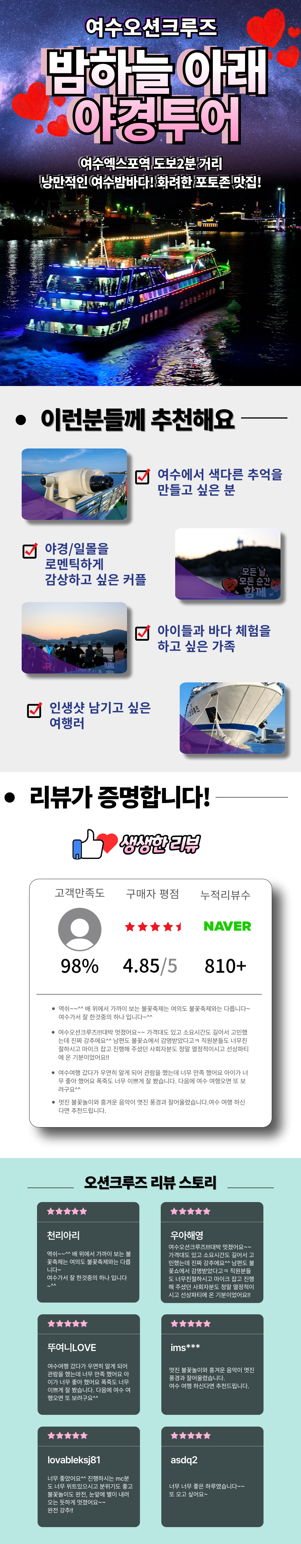 노을/야경 밤하늘아래야경투어는 어둠이 내리면 하나둘 켜지는 여수항의 조명과 함께 낭만이 쏟아지는 여수밤바다를 항해하는 오션크루즈와 함께 아름다운 야경을 즐기며 특별한 시간을 보내보는 상품입니다. 함께하는 가족, 연인, 친구들과 함께 로맨틱한 분위기를 만끽할 수 있는 특별한 경험을 제공합니다.